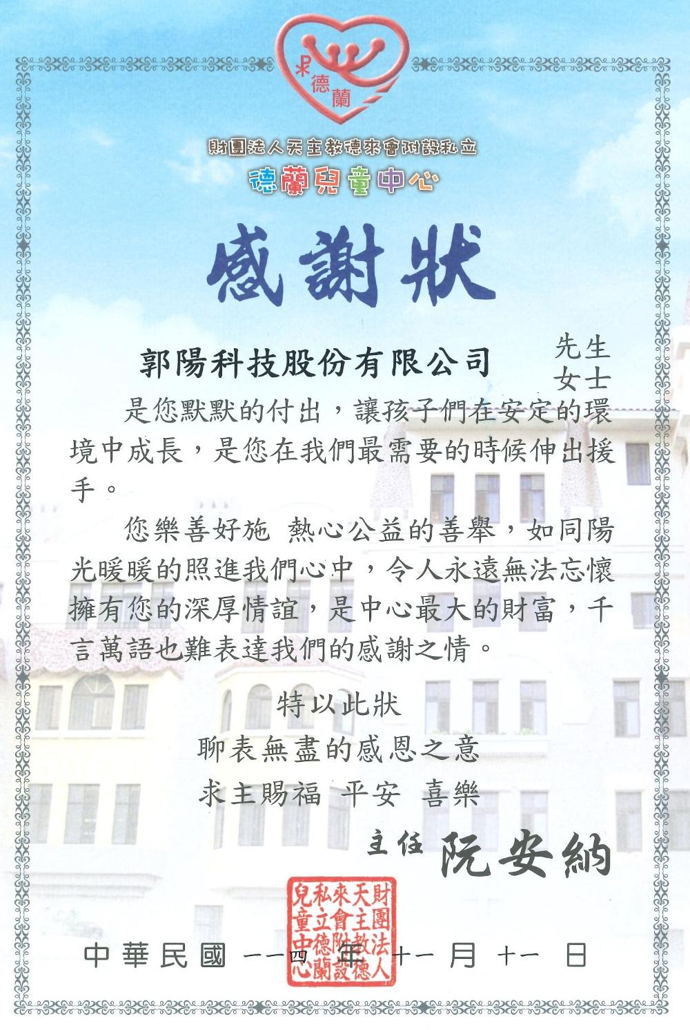 2025年 敦陽科技 守護海岸、關懷兒童 捐贈財團法人天主教德來會附設私立德蘭兒童中心