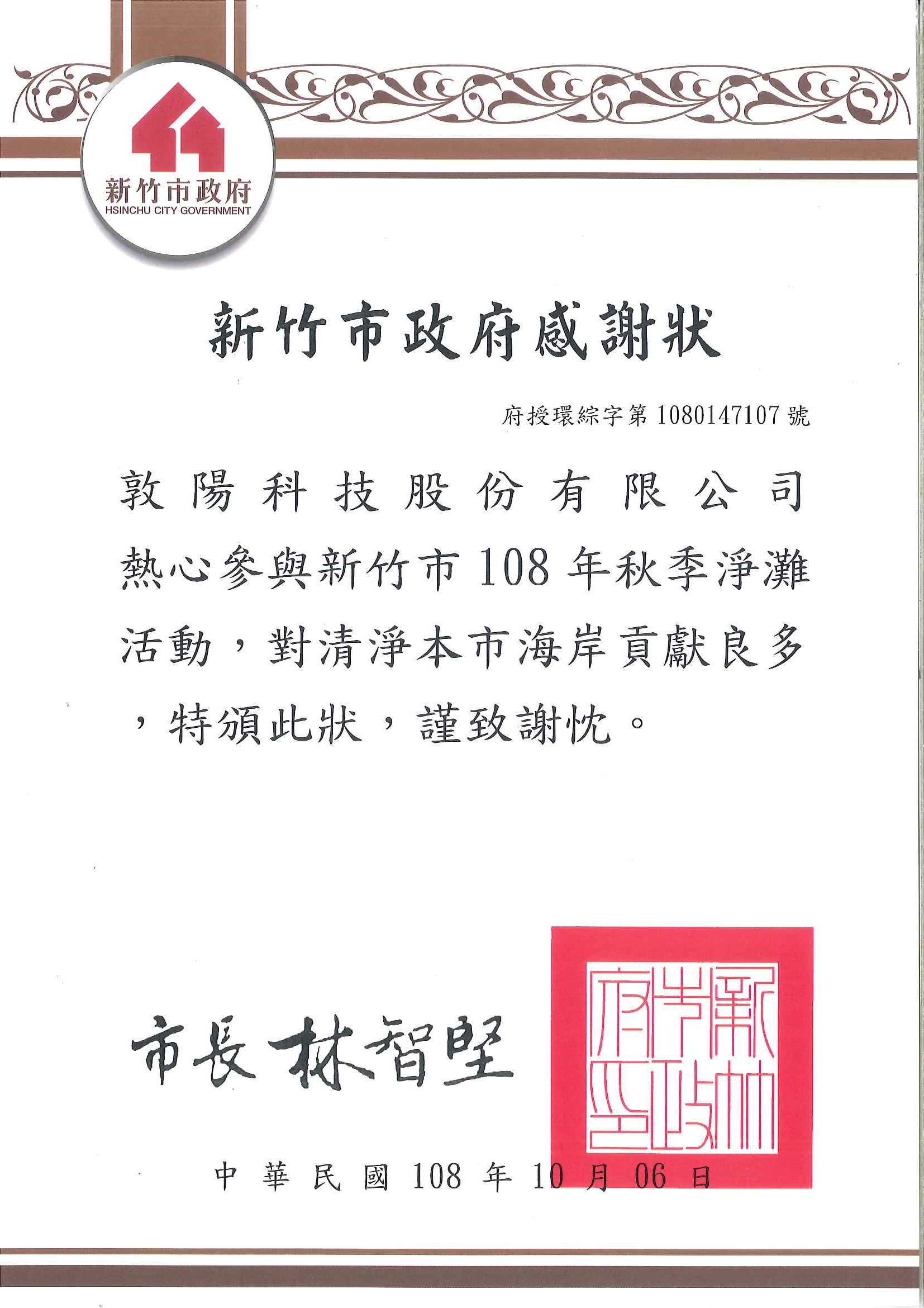 敦陽科技參加新竹市108年秋季淨灘活動 - 公告