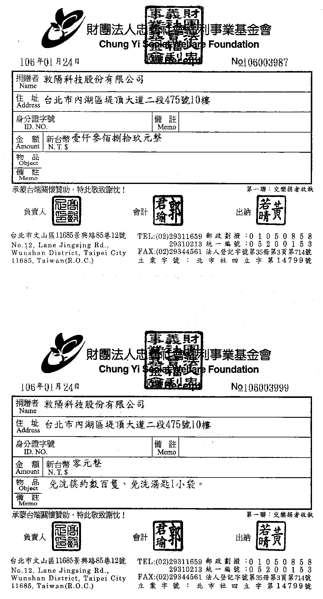 希望此次敦陽科技為善盡企業社會責任的捐贈活動